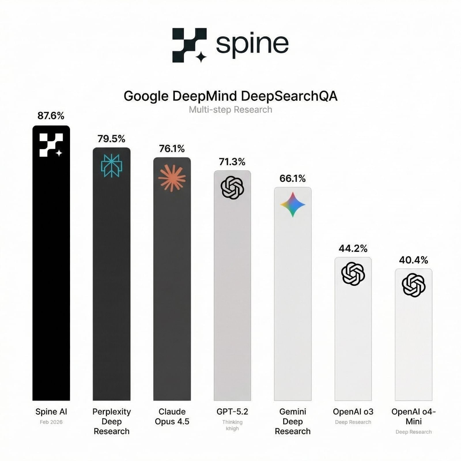 Spine Swarm achieved 87.6% on DeepSearchQA — ranking #1 on the full 900-sample benchmark, ahead of Perplexity by 8.1% and ahead of Google's own Gemini Deep Research by 21.5%.